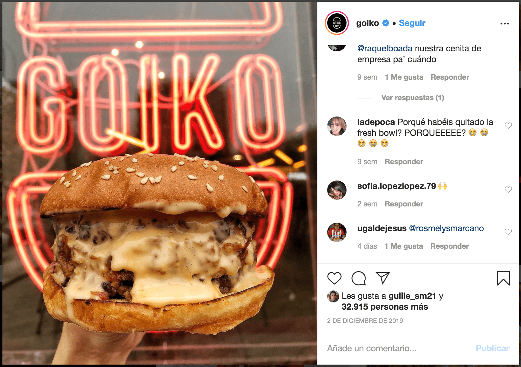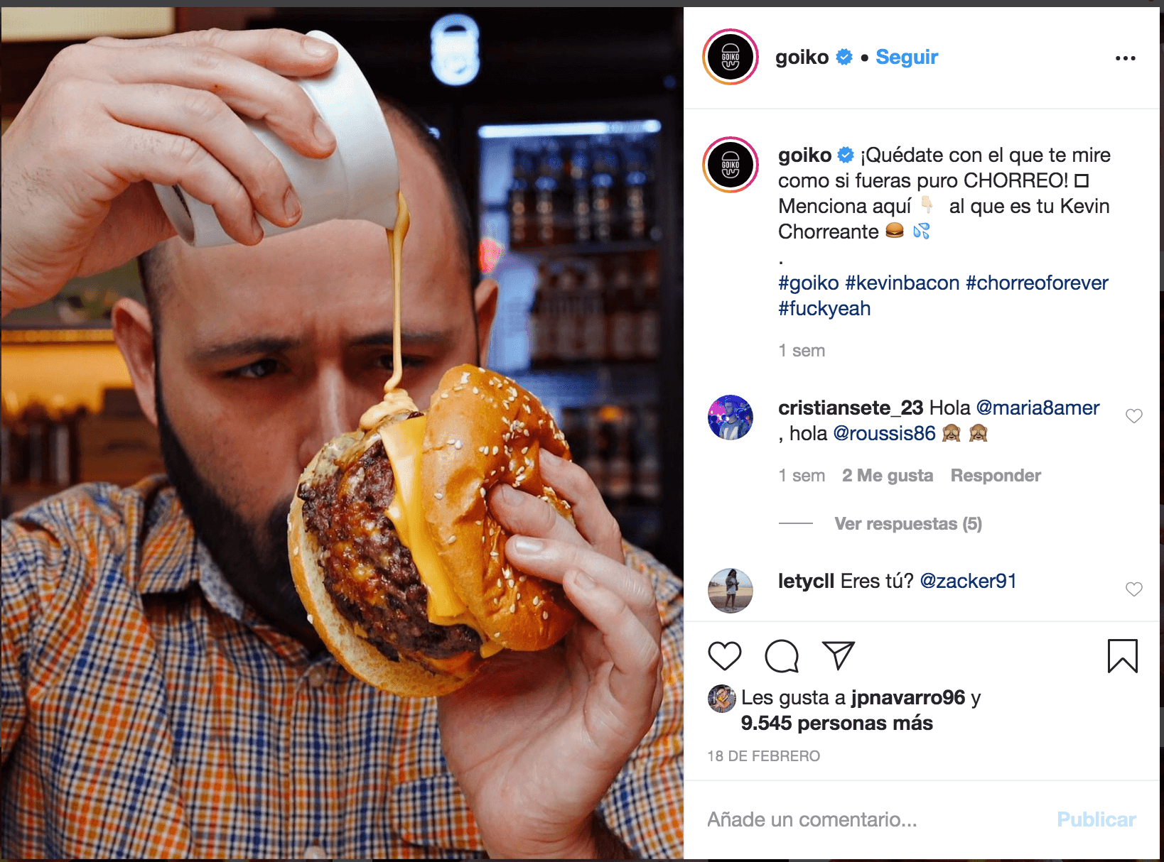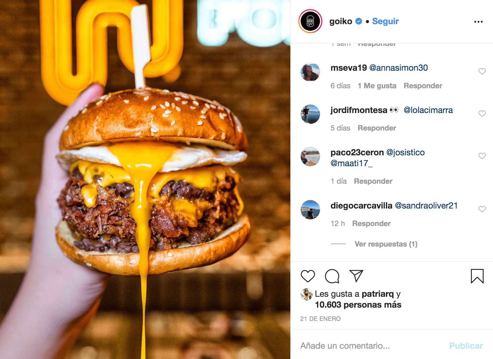 En Goiko Grill han sabido sacarle partido a las redes sociales. Tienen hasta perfiles de Goiko Grill Fans. No solo fotografían sus suculentas hamburguesas, sino que también publica fotos de sus clientes, hace concursos para su audiencia. No usan filtros pero guardan mucho la estética de sus fotos.